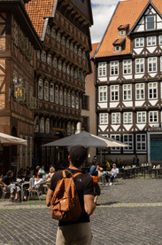 Obvezen postanek v slikovitem mestu Hildesheim za pivo, preden zapustiva Nemčijo.